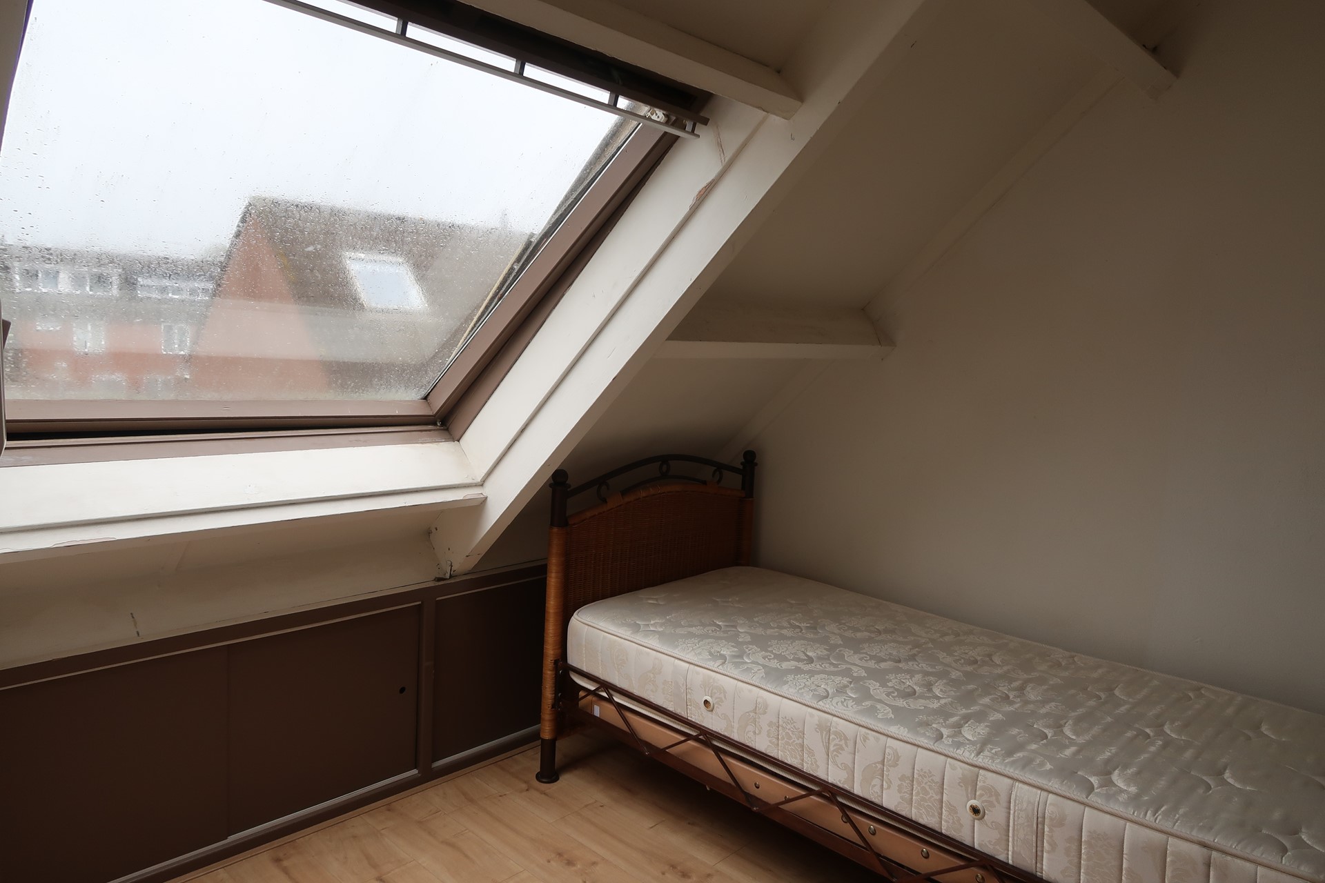 Overloop met cv ketel en wasmachineaansluiting, zolderkamer met Velux dakraam.