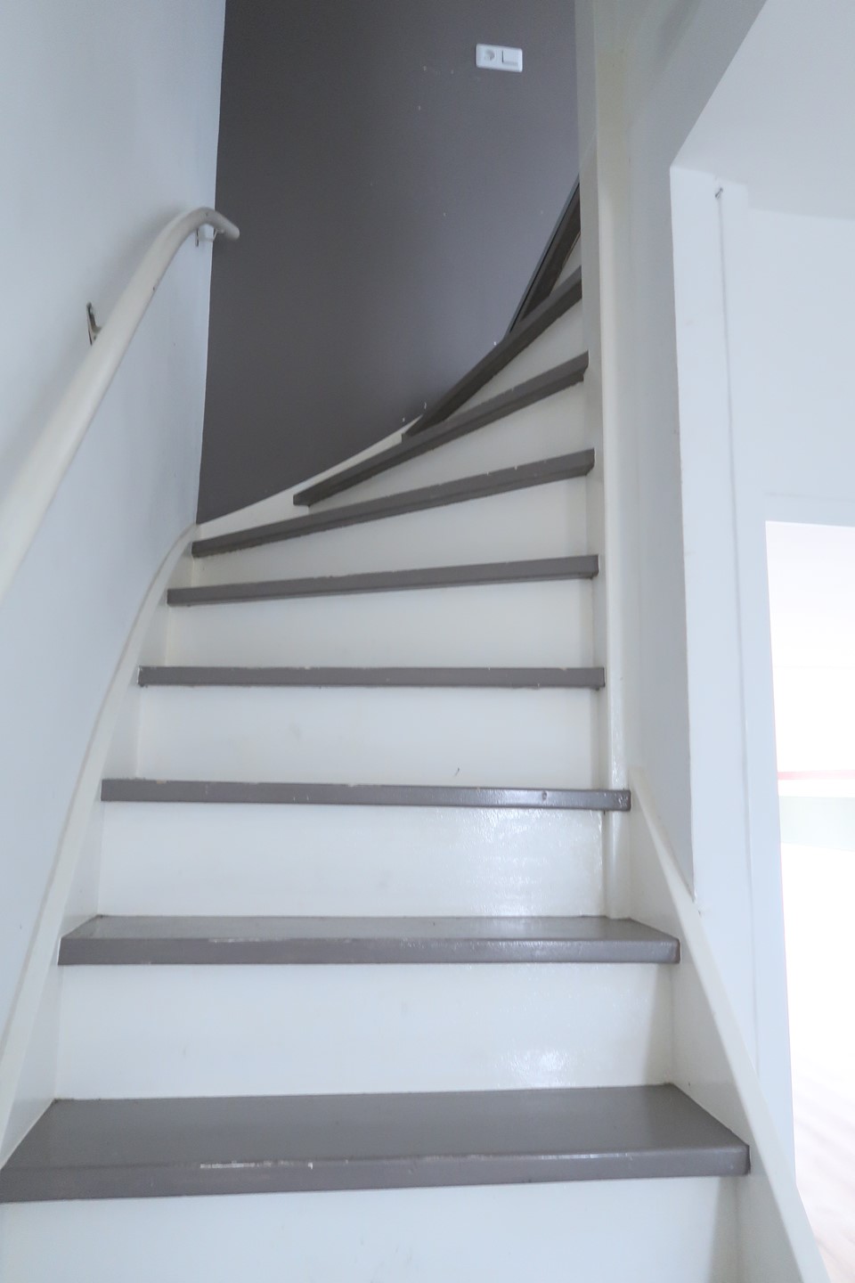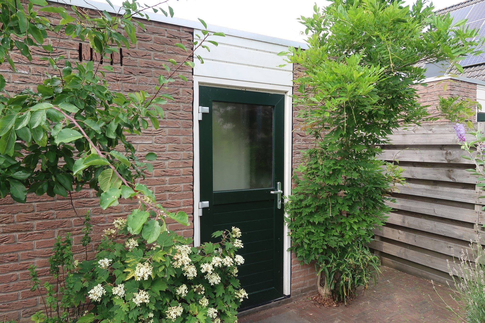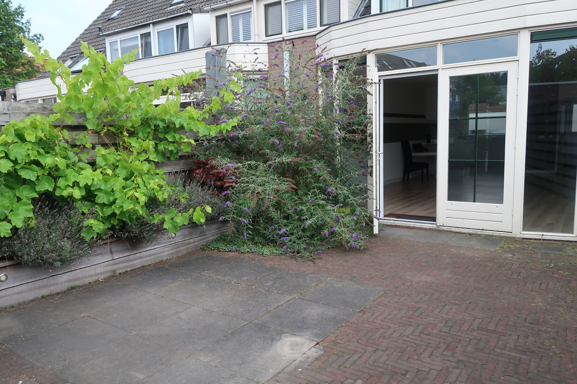 Voortuin, entree, hal, modern toilet, toegang tot het woongedeelte en de trap naar de bovenste verdiepingen. De woonkamer is uitgebouwd tot royale afmetingen van 8 x 5 meter. De tuin is gelegen op het NoordWesten en is nog altijd 7,5 x 5 meter groot. Er is een vrijstaande stenen schuur van ca. 8m2 en een achterom. De tuin is verzorgd aangelegd en heeft niet veel onderhoud nodig.