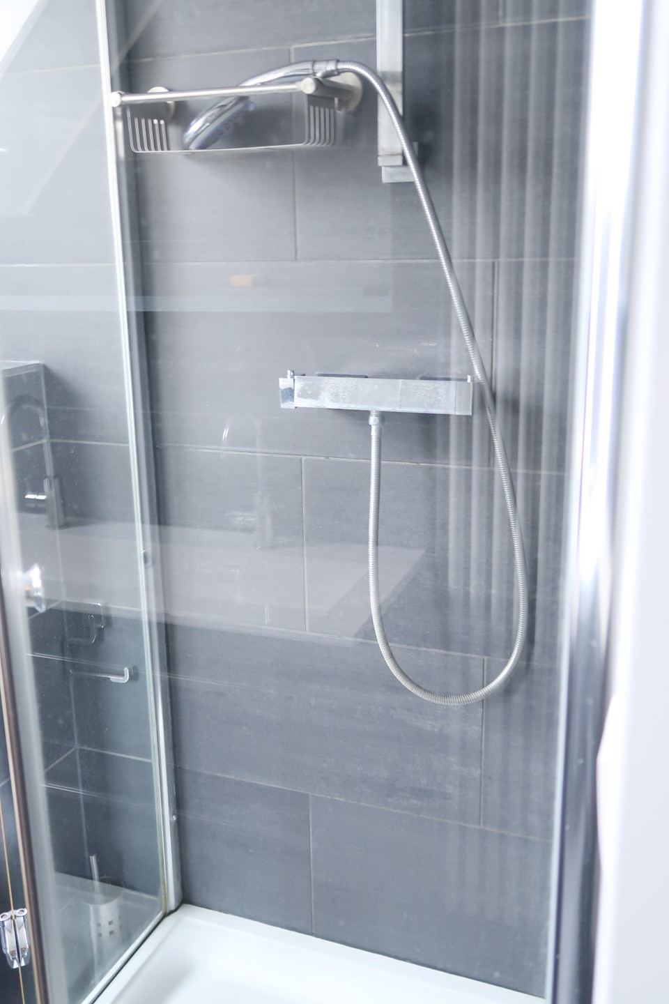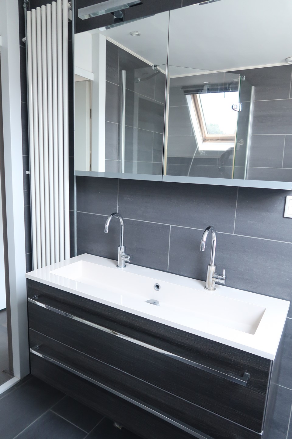 1e verdieping: Moderne badkamer met groot (en diep) ligbad, aparte douchecabine, dubbele wastafel met wastafelmeubel en een tweede toilet. Een 'ouderslaapkamer' van 4,60 x 3 meter en twee kleinere slaapkamers van 3,60 x 2 m en 3 x 2,30 m.