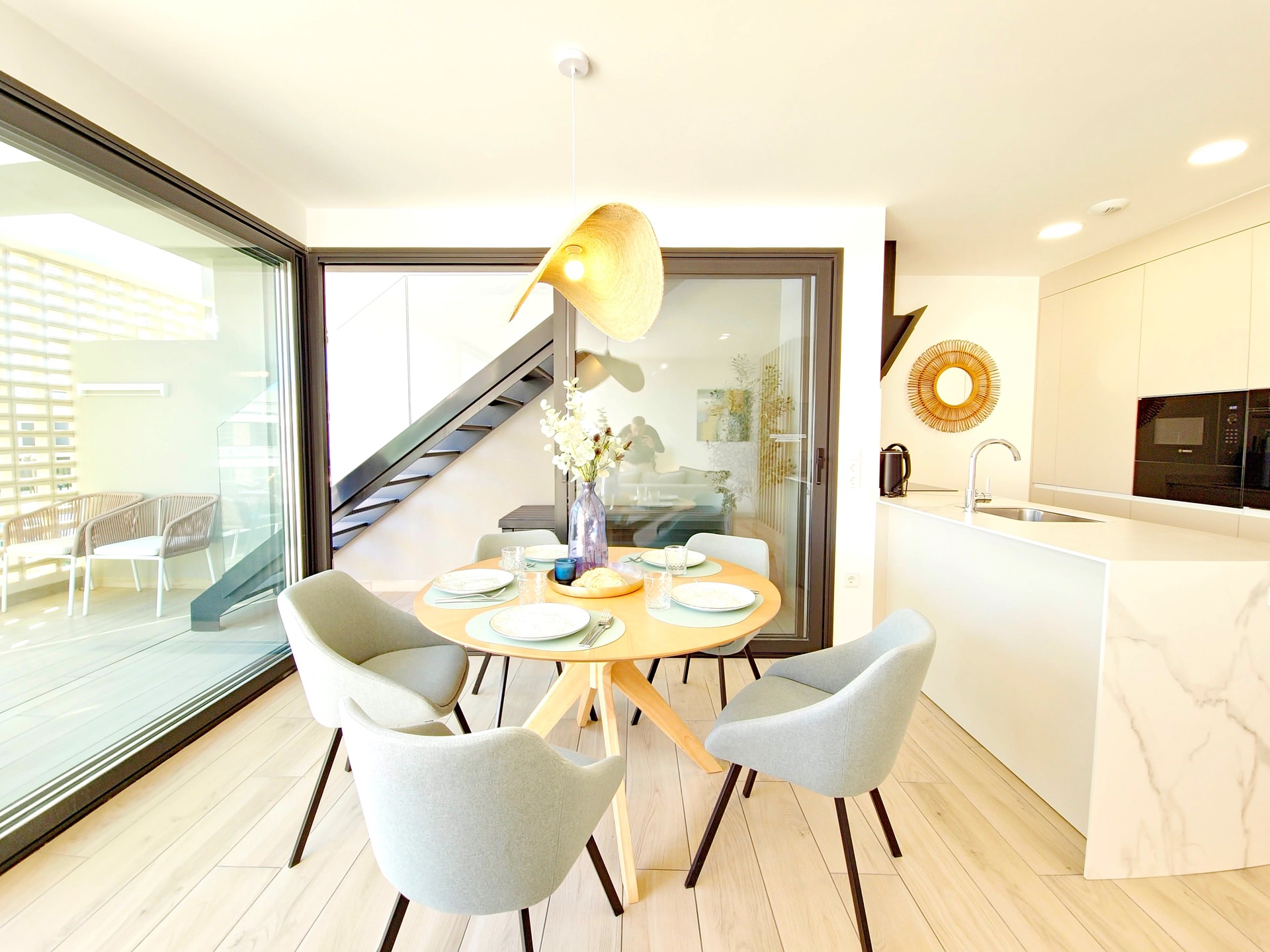 De lichte, open woonkamer en moderne keuken lopen naadloos over in het royale balkon — perfect voor je ochtendkoffie of ontbijt in de zon.