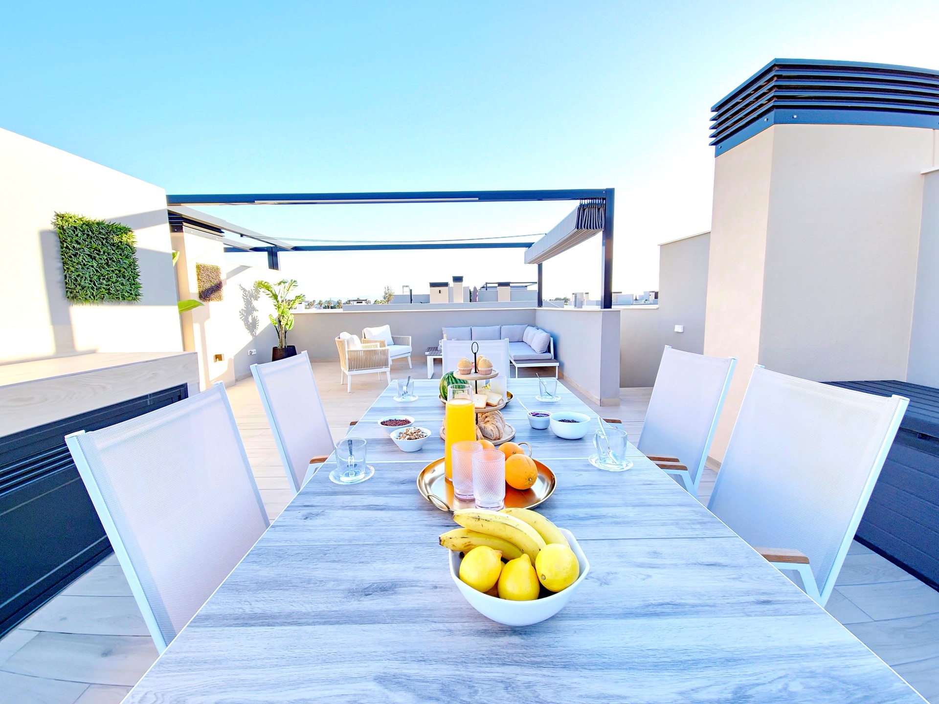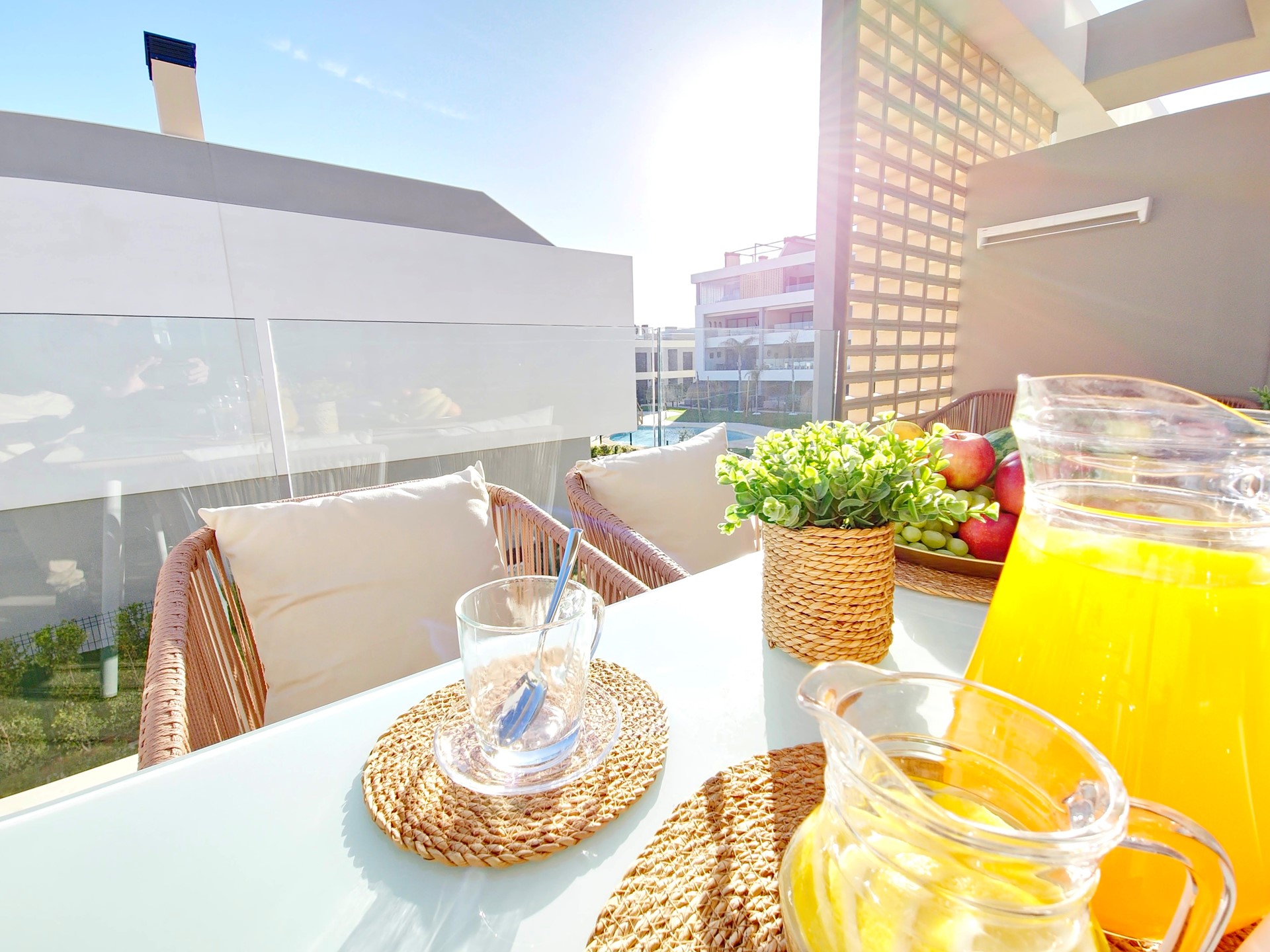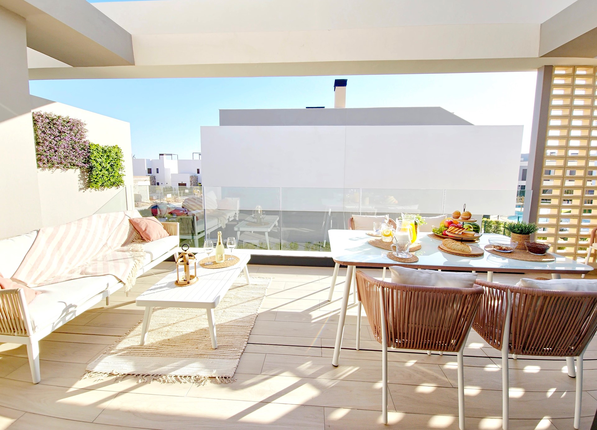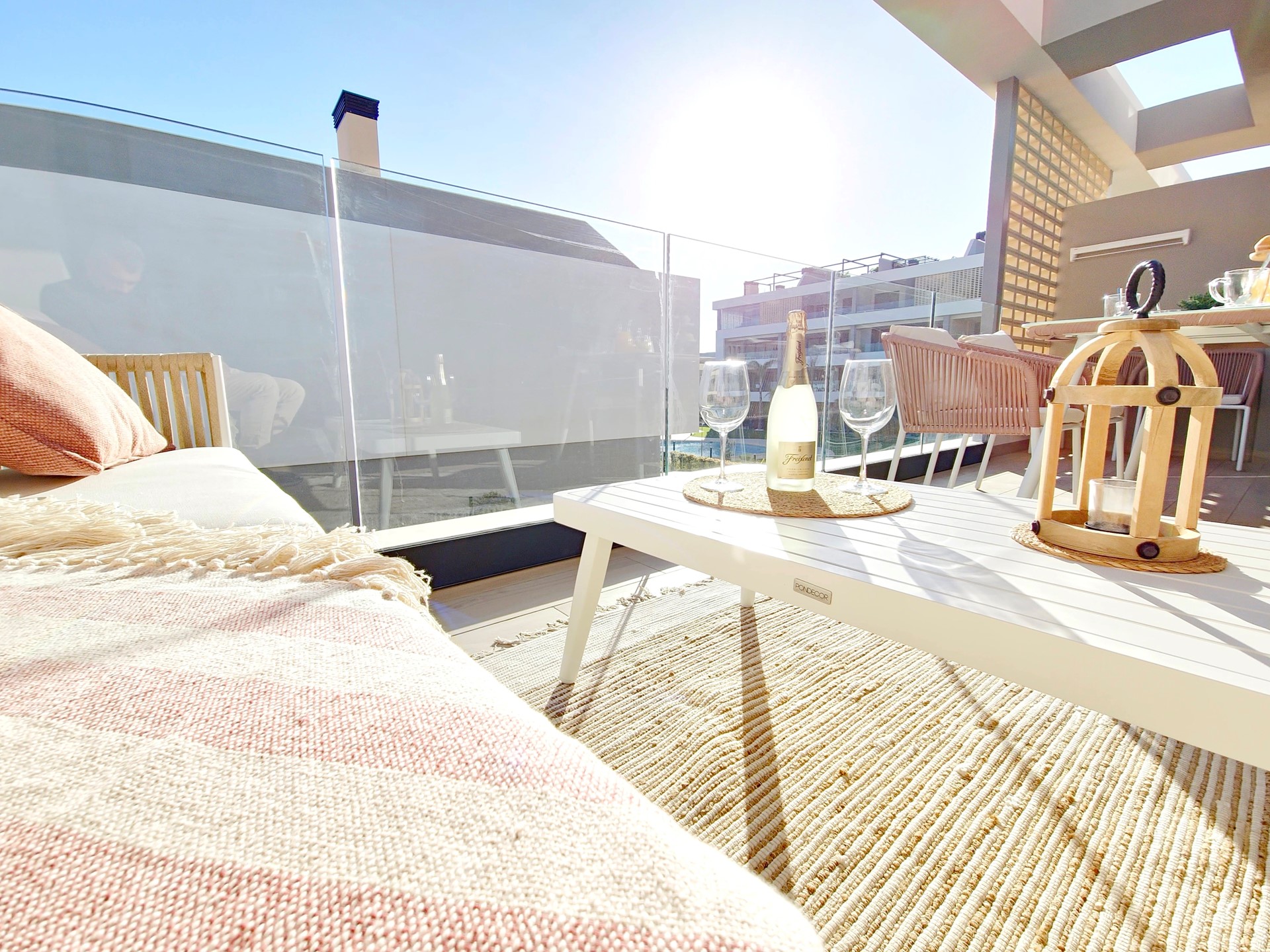 Geniet van de Spaanse zon op je privébalkon of ontspan op het ruime dakterras van ca. 75 m² met panoramisch uitzicht over het resort — ideaal voor een diner bij zonsondergang of een ontspannen dag in de zon.