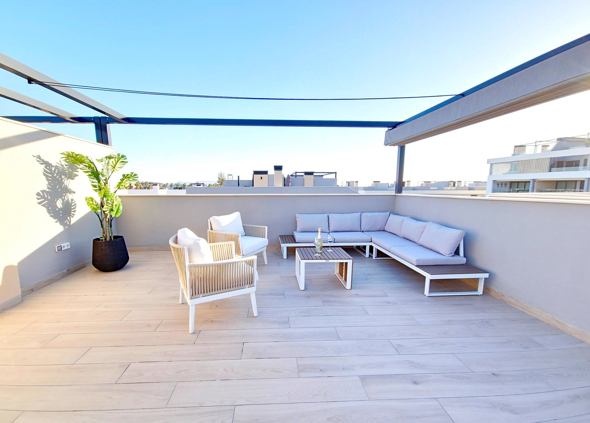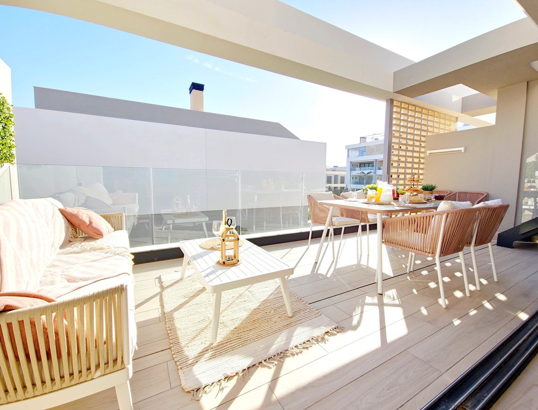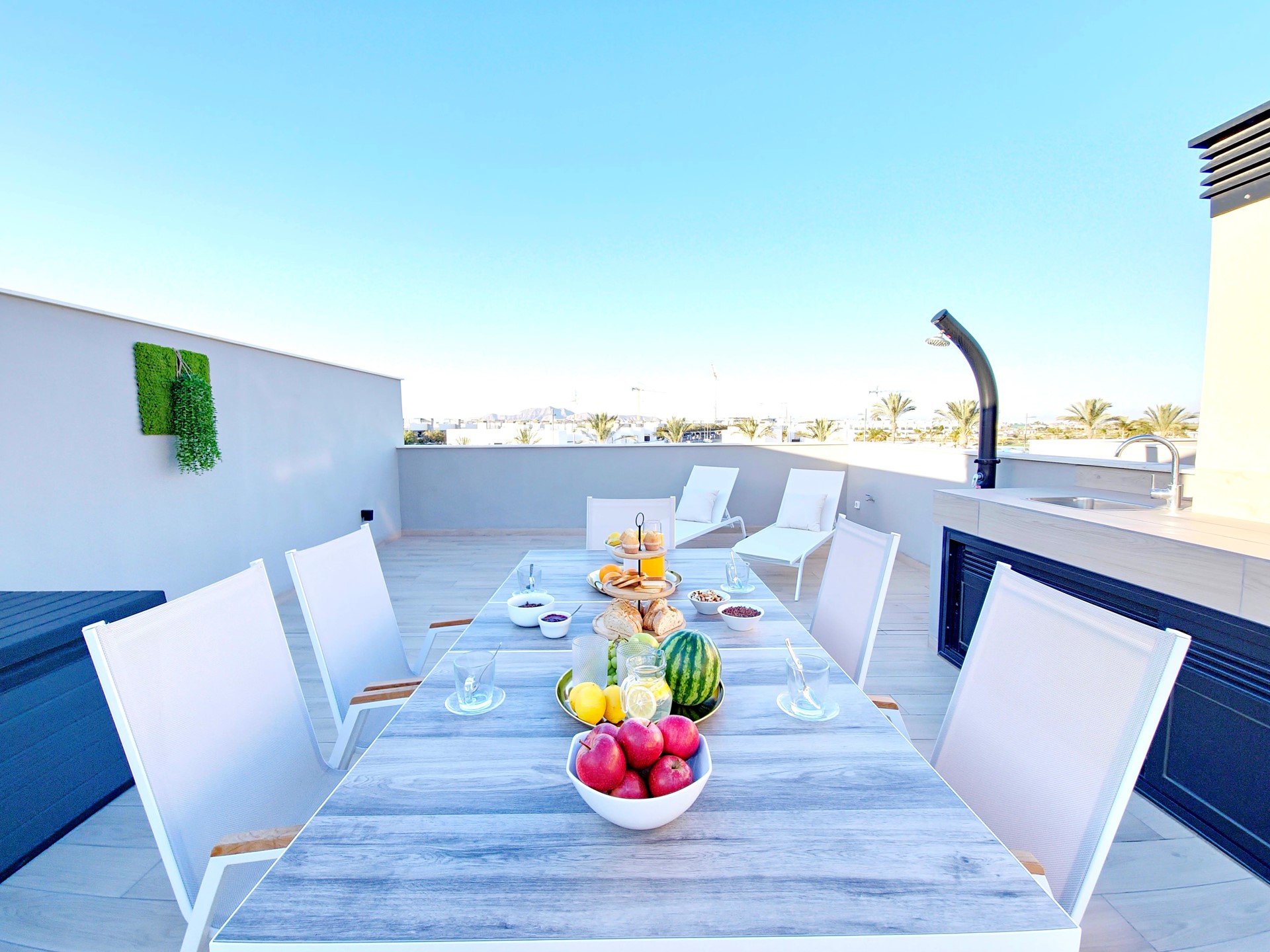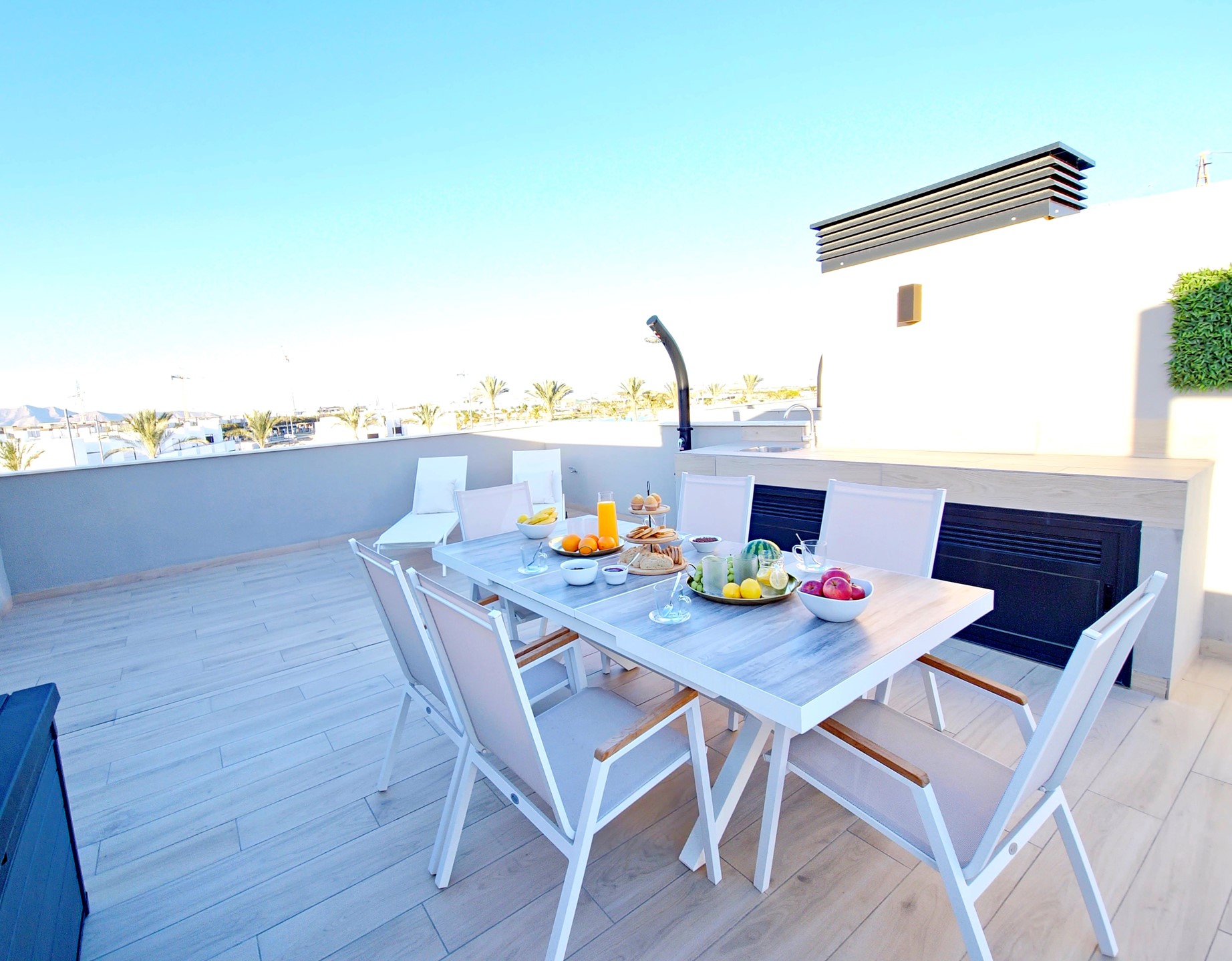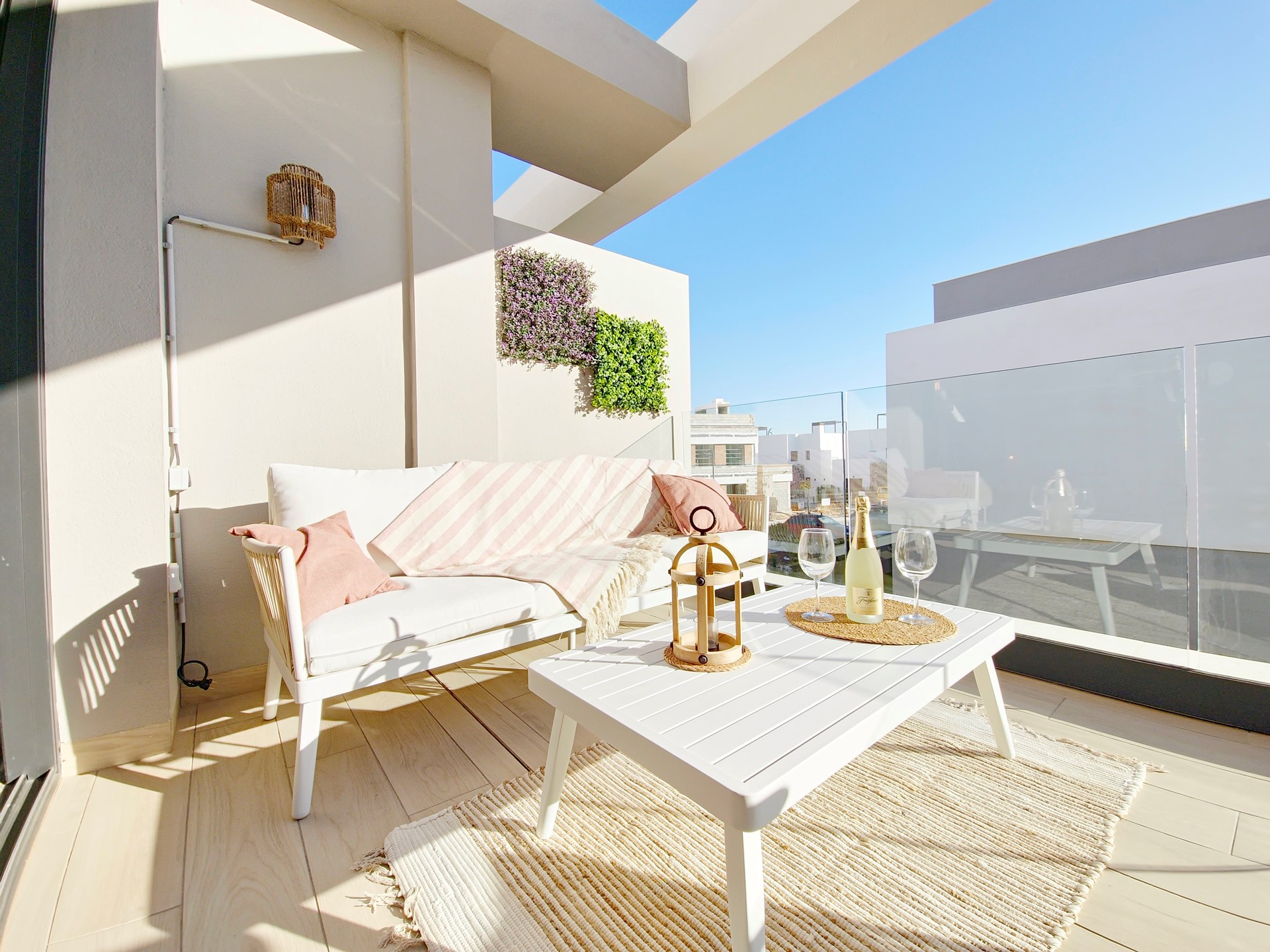 Geniet van de Spaanse zon op je privébalkon of ontspan op het ruime dakterras van ca. 75 m² met panoramisch uitzicht over het resort — ideaal voor een diner bij zonsondergang of een ontspannen dag in de zon.