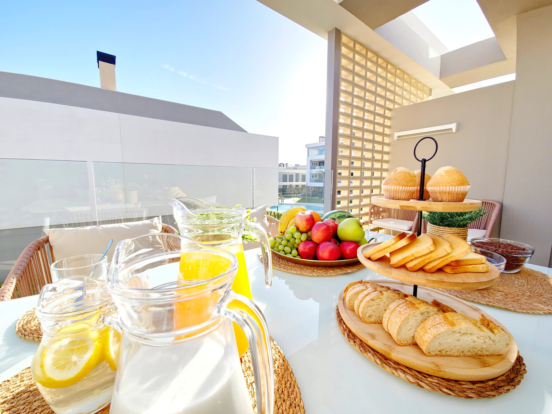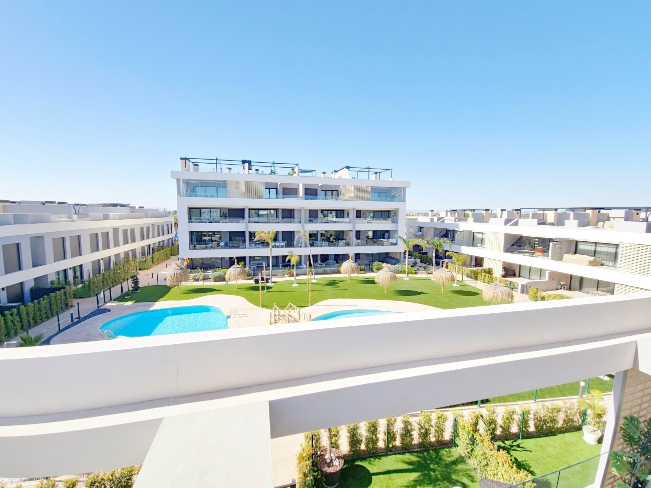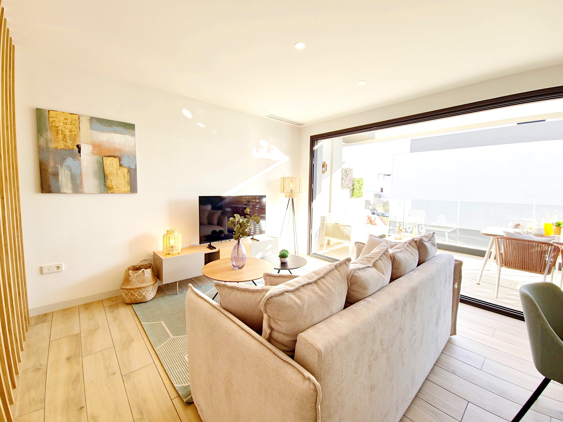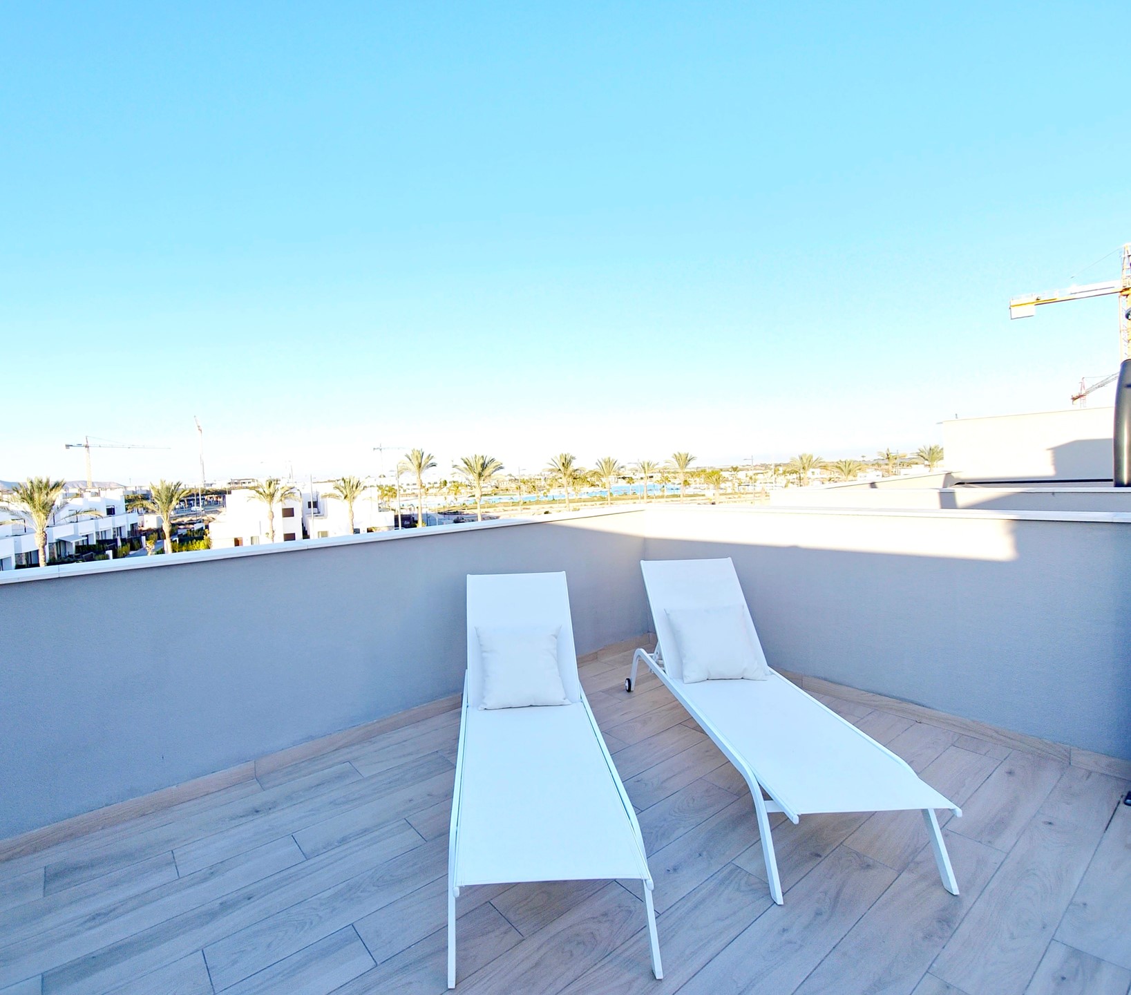 Geniet van de Spaanse zon op je privébalkon of ontspan op het ruime dakterras van ca. 75 m² met panoramisch uitzicht over het resort — ideaal voor een diner bij zonsondergang of een ontspannen dag in de zon.