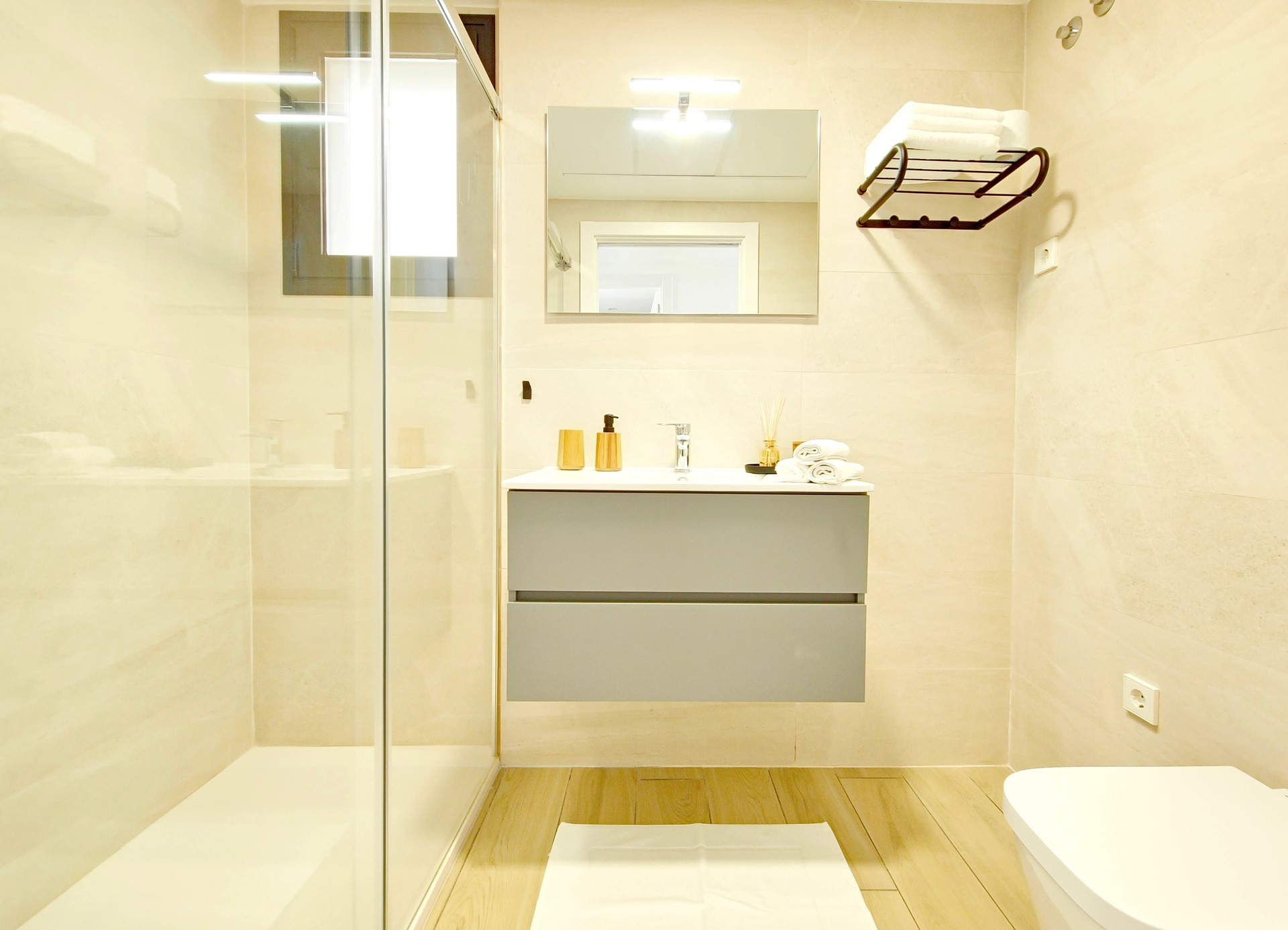Beide badkamers zijn ensuite en modern afgewerkt, met ruime inloopdouches, brede wastafels met opbergladen en een toilet.